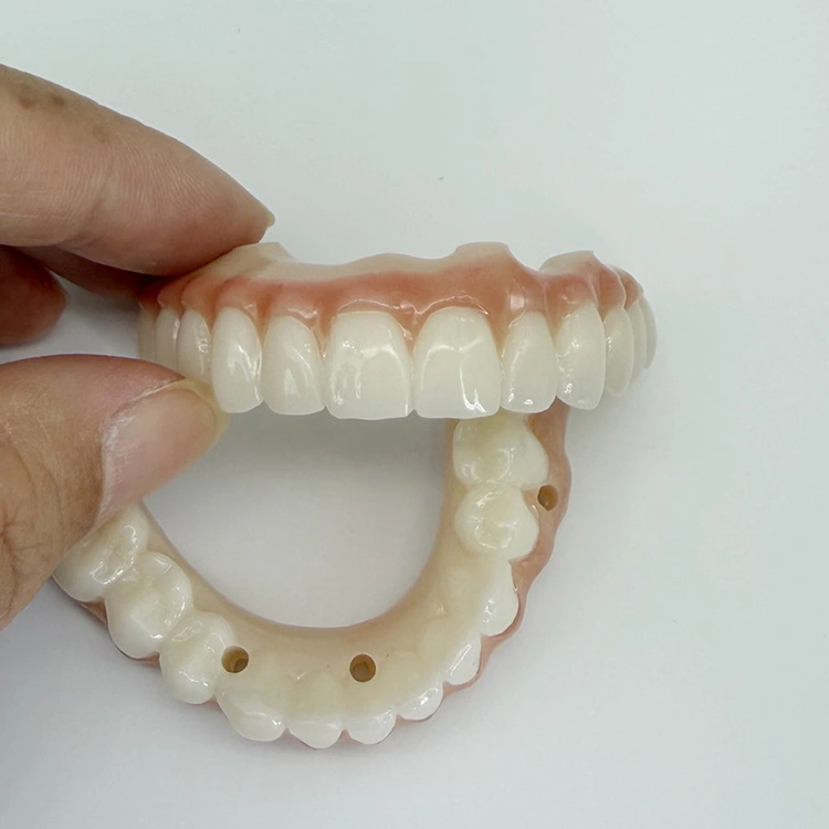 хибриден имплант мост со целосен лак, сè на x хибриден целосен цирконски мост со рачно изработена розова порцеланска естетска гума за џвакање, стоматолошка лабораторија WM од кинеската стоматолошка лабораторија обезбедува најдобро решение за глодање на целосниот лак имплант цирконски имплант мост