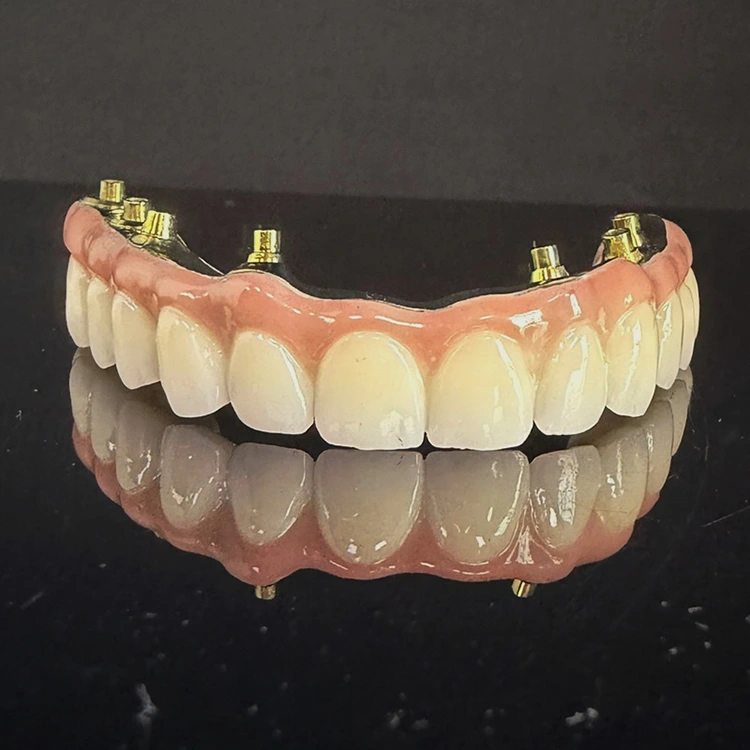 Хибрид со целосен лак, сè на 6 цирконски мост над забната шипка од титаниум, Целосно бланширан цирконски и целосно мелен титаниумски шипки со естетска розова гума за џвакање од кинеската стоматолошка лабораторија WM Dental lab